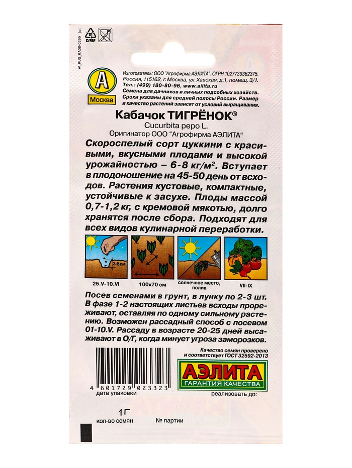 Семена Кабачок цукини «Тигрёнок», 1 г, «Аэлита» — Характеристики