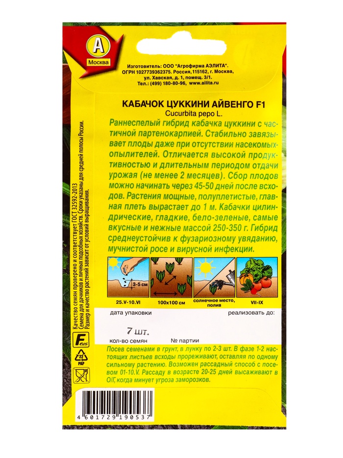 Семена Кабачок цуккини «Айвенго», F1, 7 шт., «Агрофирма АЭЛИТА» — Характеристики