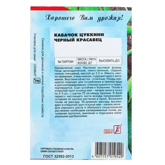 Среднеранний сорт. Растение кустовое, компактное, сильно-облиственное. На кусте завязывается сразу 3-5 плодов. Плоды цилиндрические, гладкие, сильноглянцевые, тонкокорые, темно-зеленого, почти черного цвета, длиной 18-22 см. массой 0.7-1 кг. Мякоть зеленовато-белая, толстая, нежная. Вкусовые качества при консервировании и использовании в кулинарии отличные. Достоинства сорта: длительное плодоношение, высокая урожайность и красивый внешний вид плодов.