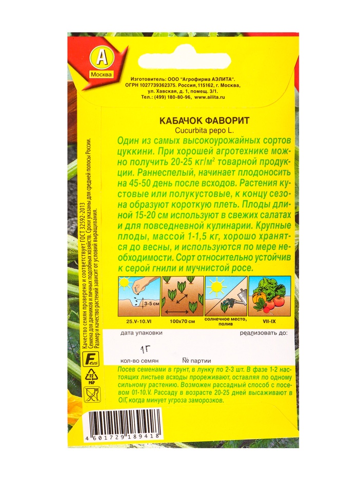 Семена Кабачок цуккини «Фаворит», 1 г, «Агрофирма АЭЛИТА» — Характеристики