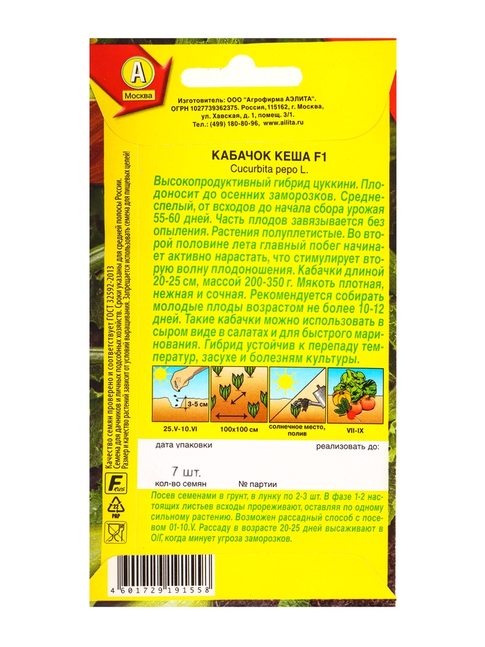 Семена Кабачок цуккини «Кеша», F1, 7 шт., «Агрофирма АЭЛИТА» — Характеристики