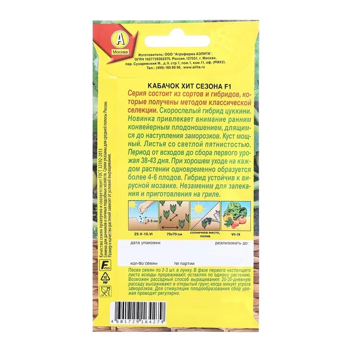 Скороспелый гибрид цуккини. Новинка привлекает внимание ранним конвейерным плодоношением, длящимся до наступления заморозков. Куст мощный. Листья со светлой пятнистостью. Период от всходов до сбо ра первого урожая 38-43 дня. При хорошем уходе на каждом растении одновременно образуется более 4-6 плодов. Гибрид устойчив к вирусной мозаике. Незаменим для запекания и приготовления на гриле.