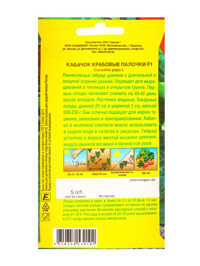 Семена Кабачок цуккини «Крабовые палочки», F1, «Семторг - Агрофирма АЭЛИТА», 5 шт. — Характеристики