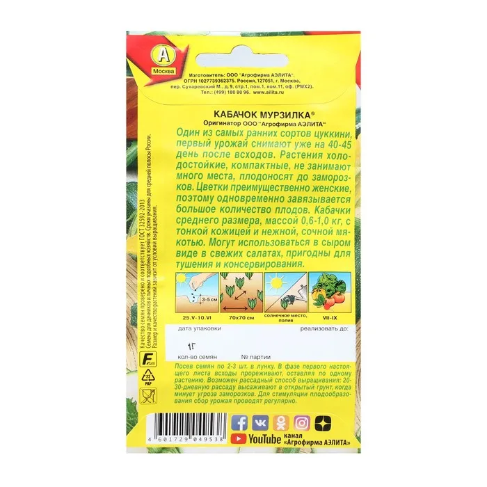 Ранний сорт, вступает в плодоношение на 45-48 день от всходов. Образует компактные, кустовые растения, насыщенные женскими цветками. Формирует цилиндрические плоды средних длины и диаметра, с тонкой, темно-зеленой кожурой, массой 0,6-1,0 кг. Мякоть плода белая, плотная, сочная, с богатым комплексом витаминов, полезных минеральных солей и других биологически активных соединений. Урожайность – 7-9 кг/м2. Сорт хорошо переносит пониженные температуры воздуха. Предназначен для повседневной домашней кулинарии и переработки на зимние заготовки. Вкус продукции отличный.