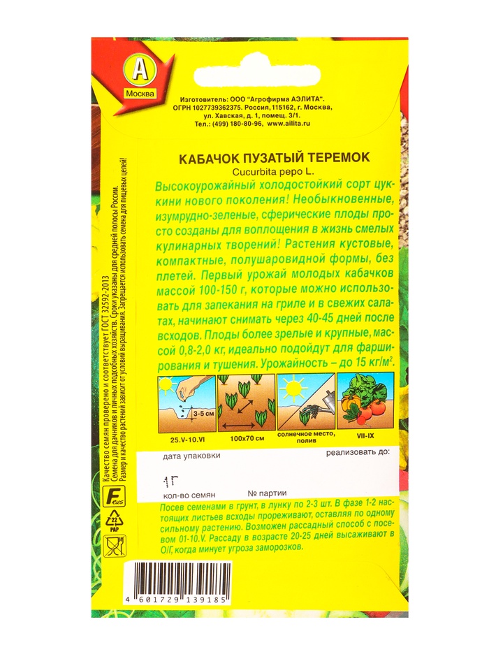 Семена Кабачок цуккини «Пузатый теремок», 1 г, «Агрофирма АЭЛИТА» — Характеристики