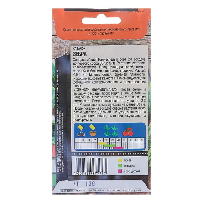 Раннеспелый холодостойкий сорт (от всходов до первого сбора – 40-50 дней). Урожайность высокая, 7-8 кг/м2. Растение кустовое, со слабым ветвлением, преимущественно женского типа цветения. Плоды цилиндрические, массой 0,9-1,1 кг. Мякоть желтовато-белая, плотная, нежная, отличного вкуса. Великолепно подходит для всех способов кулинарной переработки и консервирования. Плоды долгое время хранятся после съема и хорошо транспортируются.
