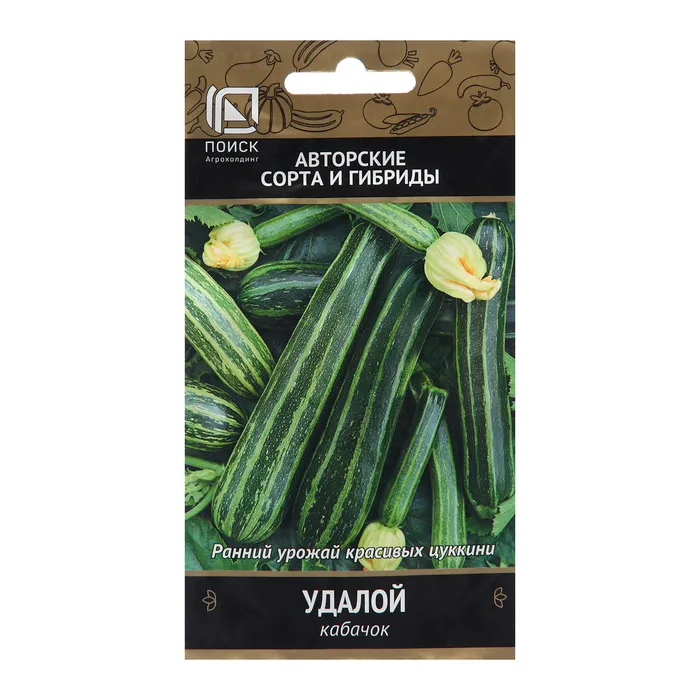 Кабачок Удалой - ранний урожай красивых цуккини. Ранний высокоурожайный сорт. Сорт для открытого грунта и парников. Период от всходов до сбора урожая 35-40 дней. Растение кустовое, компактное. Плод цилиндрический. Поверхность слаборебристая, светло-зеленая, рисунок в виде широких продольных темно-зеленых полос. Масса в технической спелости 0,5-1,2 кг. Мякоть беловато-зелёная, мало сладкая, сочная. Транспортабельность плодов хорошая.