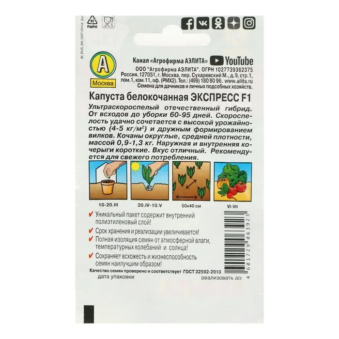 Семена Капуста белокочанная "Экспресс" F1 "Лидер", 20 шт, — Характеристики