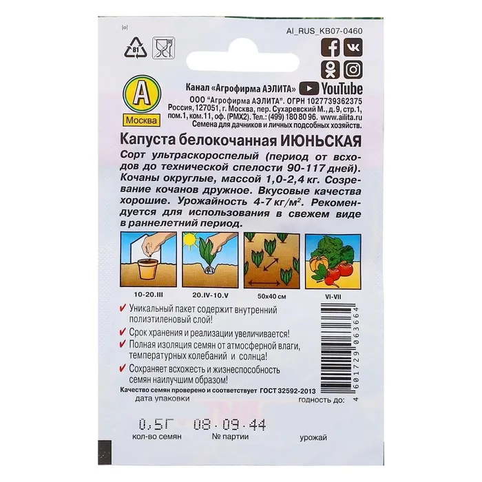 Ультраскороспелый гибрид созревает через 90‒117 дней после всходов. «Июньская» капуста не боится распространённых заболеваний и холода до –5 °C. Крупные кочаны массой до 2,4 кг имеют отменный вкус в любых горячих блюдах и домашних заготовках и хорошо сохраняются при заморозке.