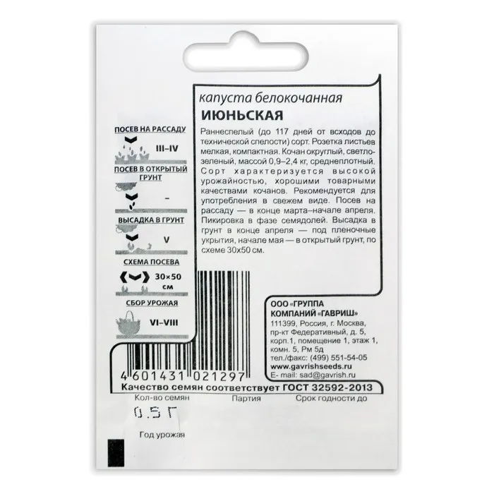 Семена Капуста белокочанная "Июньская", ранняя, б/п, 0,1 г — Характеристики