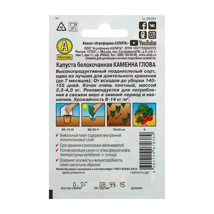 Высокоурожайный позднеспелый сорт (период от полных всходов до уборки кочанов 140-155 дней). Кочаны крупные, массой 3,5-4,0 кг, округлой формы, очень плотные, устойчивы к растрескиванию. Сорт подходит для употребления в свежем виде, квашения и длительного хранения. Отличается устойчивостью к болезням и хорошей транспортабельностью.