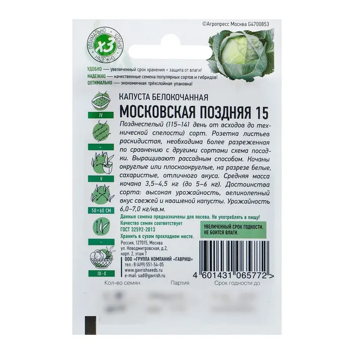 Семена Капуста белокочанная "Московская поздняя 15", для квашения, 0,1 г серия ХИТ х3 — Характеристики