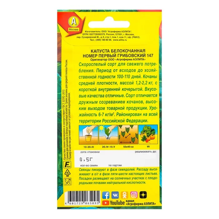 Семена Капуста белокочанная "Номер первый Грибовский 147", 0,5 г — Характеристики