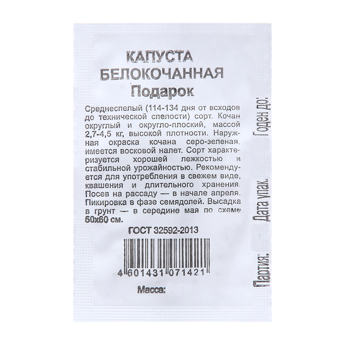 Кочан круглый и плоскоокруглый, массой 2,7-4,4 кг, высокой плотности. Наружная окраска серо-зеленая, имеется восковой налет.