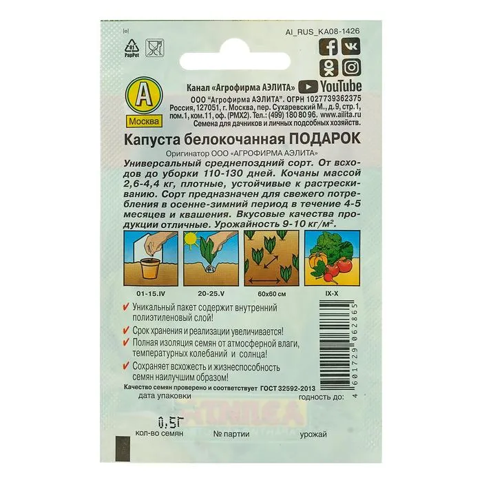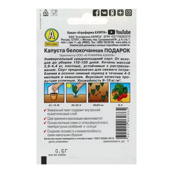 Сорт среднепоздний, от всходов до технической спелости 114-130 дней. Кочаны округлые и округло-плоские, очень плотные, массой 2,7-4,4 кг, устойчивы к растрескиванию. Транспортабельность высокая. Урожайность до 10 кг/м2 . Отличается хорошей лежкостью (до марта) и высокими вкусовыми качествами в свежем и квашеном виде. Сорт районирован повсеместно.