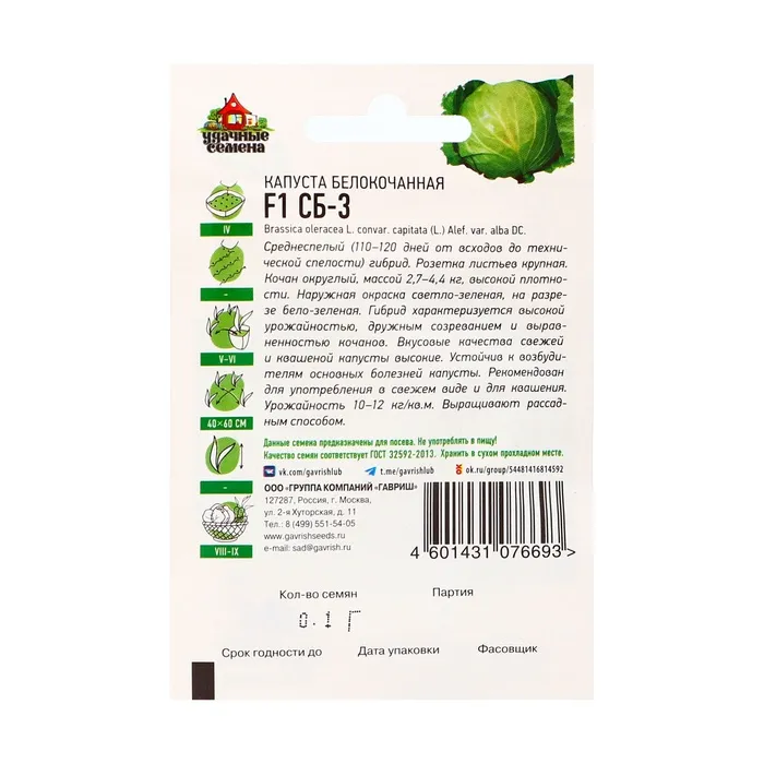 Семена Капуста белокочанная "СБ-3" F1 для квашения, 0,1 г серия ХИТ х3 — Характеристики