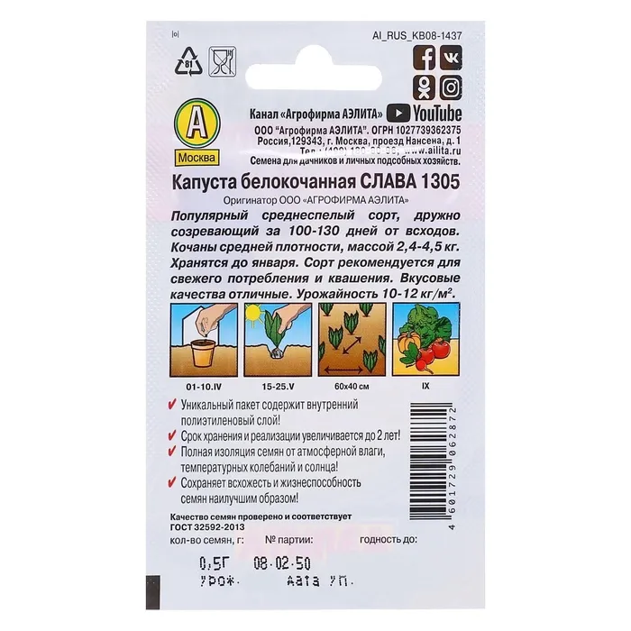 Семена Капуста белокочанная "Слава 1305" "Лидер", среднеспелый, 0,5 г , — Характеристики