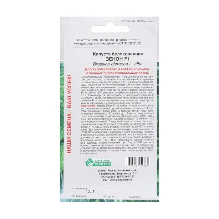 Высокоурожайный, позднеспелый гибрид белокочанной капусты для засолки, успешный в поле, надежный в хранении. Вегетационный период составляет 130-135 дней от высадки рассады. Мощное растение с хорошо развитым листовым аппаратом. Кочаны округлые, выровненные по форме и размеру, с превосходной внутренней структурой светло-зеленого цвета, среднего веса 3-4 кг. Уже на 100-й день вегетации масса кочана составляет около 2,5 кг. Рекомендуется для переработки, длительного хранения до 8 месяцев и более. Качество кочанов после длительного хранения отличное. В засолке превосходного вкуса и качества. Имеет устойчивость к фузариозу и внутреннему точечному некрозу.