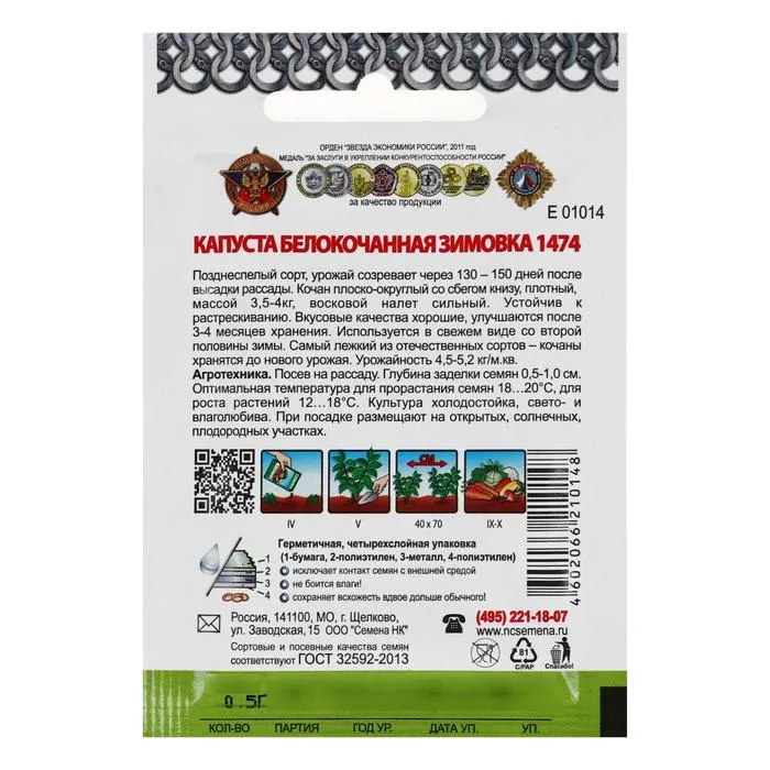 Семена Капуста белокочанная, "Зимовка 1474", серия Кольчуга NEW, 0.5 г — Характеристики