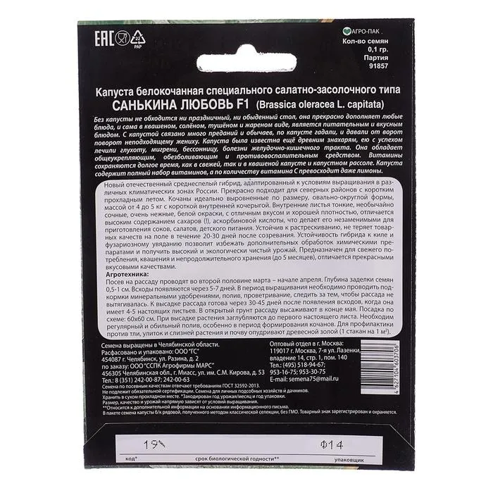 Новый отечественный среднеспелый гибрид, адаптированный к условиям выращивания в различных климатических зонах России. Прекрасно подходит для северных районов с коротким прохладным летом. Кочан идеально выровненные по размеру, овально-округлой формы, массой от 4 до 5 кг с короткой внутренней кочерыгой. Внутренние листья тонкие, необычайно сочные, очень нежные, белой окраски, с отличным вкусом и хорошей плотностью, отличается высоким содержанием сахаров (!), аскорбиновой кислоты что делает его незаменимыми для приготовления соков, салатов, детского питания. Устойчив к растрескиванию, не теряет товарных качеств на поле в течение 20-30 дней после созревания. Устойчивость гибрида к киле и фузариозному увяданию позволит избежать дополнительных обработок химическими препаратами и получить высокий и экологически чистый урожай. Предназначен для свежего потребления, квашения и непродолжительного хранения (до 5 месяцев), отличается прекрасными вкусовыми качествами.
