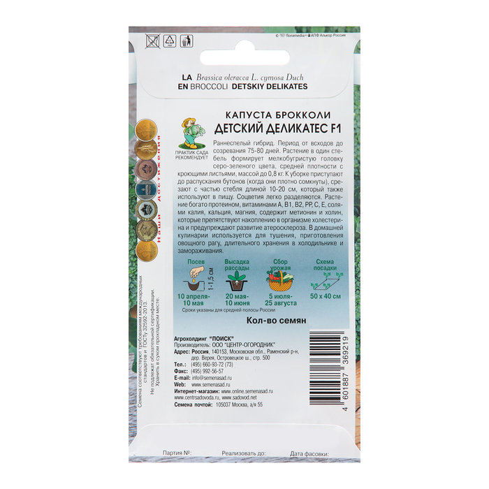 Капуста брокколи Детский деликатес F1 - богата протеином и витаминами Раннеспелый гибрид: 75-80 дней от всходов до созревания Масса головки: до 0,8 кг Растение в один стебель формирует мелкобугристую головку серо-зеленого цвета, средней плотности с кроющими листьями Содержит метионин и холин, которые препятствуют накоплению в организме холестерина и предупреждают развитие атеросклероза Рекомендуется для домашней кулинарии, длительного хранения в холодильнике и замораживания