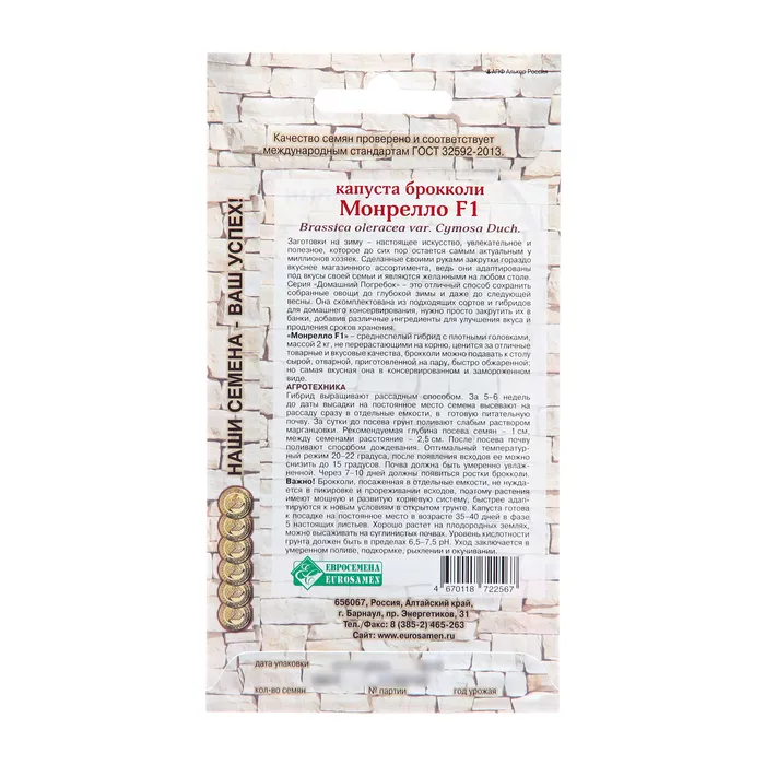 Семена Капуста брокколи "Монрелло", F1, 10 шт — Характеристики