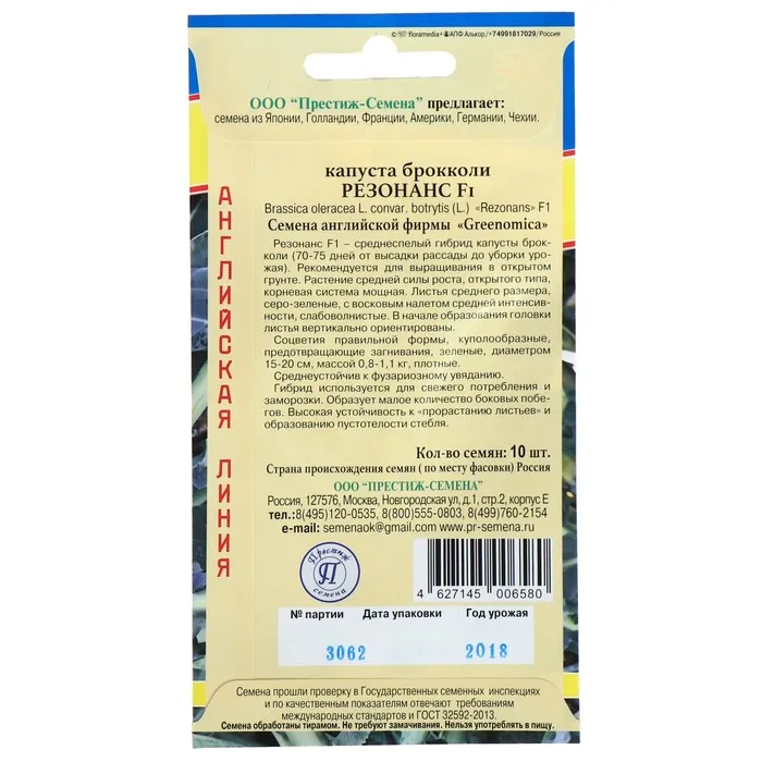 Резонанс F1 – среднеспелый гибрид капусты брокколи (70-75 дней от высадки рассады до уборки урожая). Рекомендуется для выращивания в открытом грунте. Растение средней силы роста, открытого типа, корневая система мощная. Листья среднего размера, серо-зеленые, с восковым налетом средней интенсивности, слабоволнистые. В начале образования головки листья вертикально ориентированы. Соцветия правильной формы, куполообразные, предотвращающие загнивания, зеленые, диаметром 15-20 см, массой 0,8-1,1 кг, плотные. Среднеустойчив к фузариозному увяданию. Гибрид используется для свежего потребления и заморозки. Образует малое количество боковых побегов. Высокая устойчивость к «прорастанию листьев» и образованию пустотелости стебля.