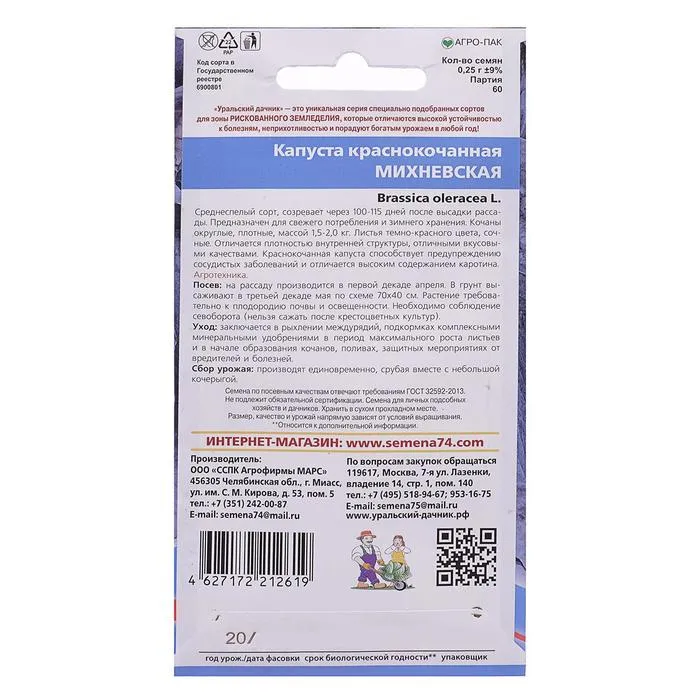 Среднеспелый сорт, созревает через 100-115 дней после высадки рассады. Предназначен для свежего потребления и зимнего хранения. Кочаны округлые, плотные, массой 1,5-2,0 кг. Листья тёмно-красного цвета, сочные. Отличается плотностью внутренней структуры, отличными вкусовыми качествами. Краснокочанная капуста способствует предупреждению сосудистых заболеваний и отличается высоким содержанием каротина.