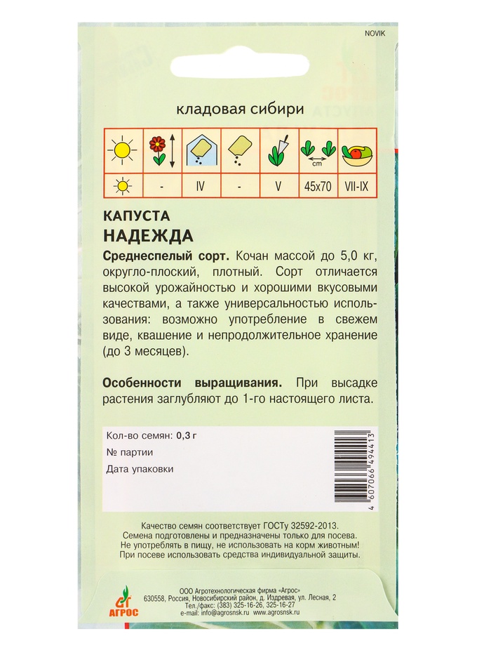 Семена Капуста «Надежда», 0.3 г, «Агросс» — Характеристики