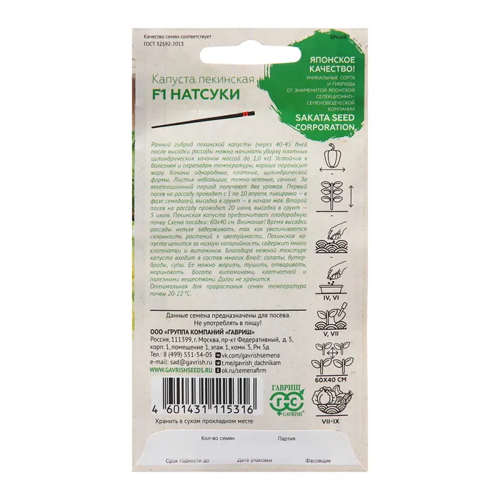 Ранний гибрид пекинской капусты - спустя 40-45 дней после высадки рассады можно начинать уборку плотных цилиндрических кочанов массой до 1,0 кг. Устойчив к болезням и перепадам температур, хорошо переносит жару. Кочаны однородные, плотные, цилиндрической формы. Листья небольшие, темно-зеленые, сочные. За вегетационный период получают два урожая. Первый посев на рассаду проводят с 1 по 10 апреля, пикировка в фазе семядолей, высадка в грунт — в начале мая. Второй посев на рассаду проводят 20 июня. Высадка в грунт — 5 июля. Пекинская капуста предпочитает плодородную почву. Схема посадки: 60х40 см. Внимание! Время высадки рассады нельзя задерживать, так как увеличивается склонность растений к цветушности. Пекинская капуста ценится за низкую калорийность, содержит много клетчатки и витаминов. Благодаря нежной текстуре капуста входит в состав многих блюд: салаты, бутерброды, супы. Ее можно жарить, тушить, отваривать, мариновать. Богата витаминами, клетчаткой и полезными веществами. Долго не хранится.Оптимальная для прорастания семян температура почвы 20-22С.
