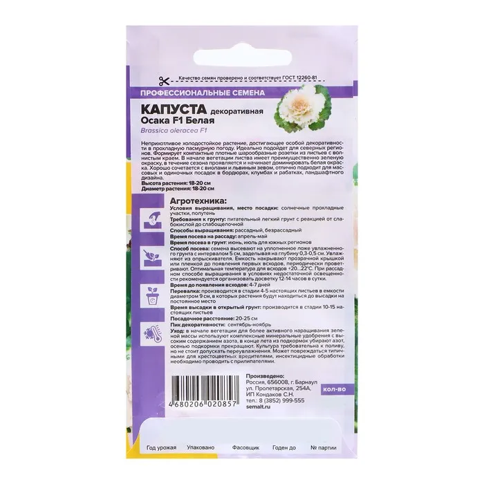 Оригинальная серия декоративной капусты! Кочан аккуратный, компактный. Изумрудные гладкие с волнистым краем листья образуют широкую плотную розетку на крепком толстом стебле-кочерыге. С понижением температуры центральные листья начинают окрашиваться в белый цвет, и к осени растение приобретает наиболее эффектный вид. Прекрасно будет смотреться в одиночных и групповых посадках, при создании бордюров, отличная культура и для контейнерных композиций. Она может радовать Вас до Нового года, если Вы пересадите ее в большой горшок и занесете в помещение. Холодостойкое растение, отлично переносит кратковременные заморозки, хорошо растет на солнечных участках и в полутени. На рассаду семена высевают с конца марта, их раскладывают по поверхности увлажненного субстрата, присыпая тонким слоем песка. Глубина заделки 0,3-0,5 см. Посадочный интервал 35-40 см. При температуре +18-20°С всходы появляются на 5-8 день. Молодые всходы лишь немного опрыскивают, а поливать начинают, когда они окрепнут. Выращивают рассаду при температуре +12-16°С, в грунт высаживают в мае. Наиболее декоративно растение с августа до морозов.