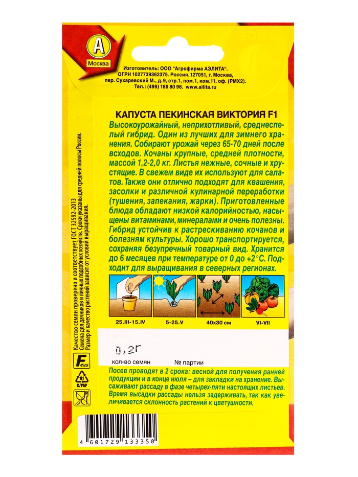 Семена Капуста пекинская «Виктория», F1, «Самое самое - Агрофирма АЭЛИТА», 0.2 г — Характеристики