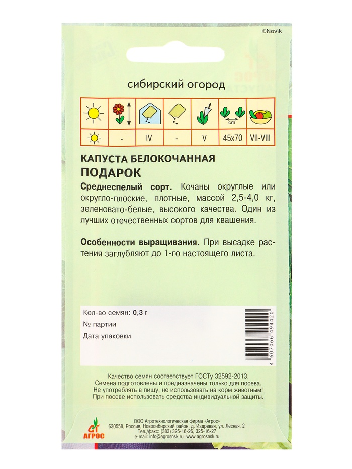 Семена Капуста «Подарок», 0.3 г, «Агросс» — Характеристики