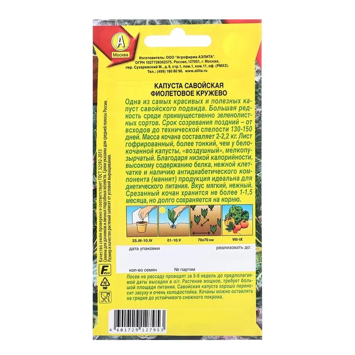 "Одна из самых красивых и полезных капуст савойского подвида. Большая редкость среди преимущественно зеленолистных сортов. Срок созревания поздний – от всходов до технической спелости 130-150 дней. Масса кочана составляет 2-2,2 кг. Лист гофрированный, более тонкий, чем у белокочанной капусты, «воздушный», мелкопузырчатый. Благодаря низкой калорийности, высокому содержанию белка, нежной клетчатке и наличию антидиабетического компонента (маннит) продукция идеальна для диетического питания. Вкус мягкий, нежный. Срезанный кочан хранится не более 1-1,5 месяцев, но долго сохраняется на корню.
