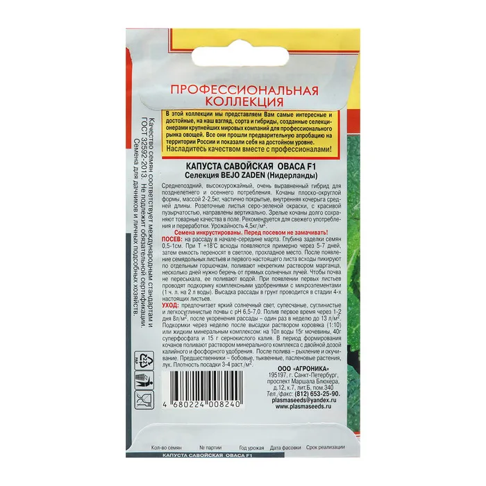Высокопродуктивный осенний гибрид. Созревает за 100 дн. от высадки рассады.Кочан округлый с короткой кочерыгой, массой 1,2 - 1,5 кг, достаточно плотный, на разрезе кремово-белый. Листья пузырчатые, темно-зеленые.Отличаются боее нежным вкусом по сравнению с белокочанной капустой. Ценность гибрида: выравненность кочанов, отличный вкус и устойчивость к болезням. Используется для свежего потребления и переработки.Посев: выращивают через рассаду.Посев производят со второй половины марта до середины апреля во влажную почву на глубину 1 - 1,5 см. Рассаду в фазе 5 - 6 настоящих листьев высаживают в первой декаде июня по 3 раст/м2. Лучшие почвы - плодородные, некислые суглинки с хорошим дренажом. Нельзя сажать после крестоцветных культур.Уход:регулярные поливы и подкормки комплексными минеральными удобрениями в период нарастания листовой массы и завязывания кочанов, рыхление междурядий, окучивание. Поливы ограничивают в период налива кочанов. Необходимы защитные мероприятия от вредителей и болезней.Сбор урожая: в сентябре. Пригодна для хранения в течение 2-3-х месяцев.
