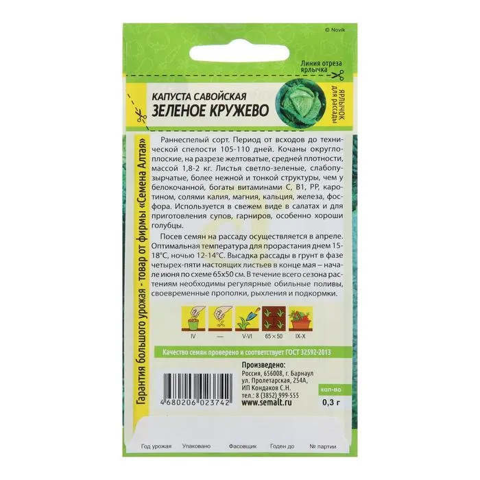 Раннеспелый сорт. Период от всходов до технической спелости 105-110 дней. Кочаны округло-плоские, на разрезе желтоватые, средней плотности, массой 1,8-2 кг. Листья светло-зеленые, слабопузырчатые, более нежной и тонкой структуры, чем у белокочанной, богаты витаминами С, B1, PP, каротином, солями калия, магния, кальция, железа, фосфора. Используется всвежем виде в салатах и для приготовления супов, гарниров, особенно хороши голубцы.
