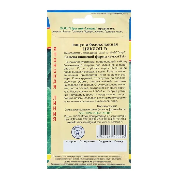 Непревзойденный гибрид для квашения. Среднеспелый. Созревает через 85-90 дней после высадки рассады. Кочан компактный, круглый, плотный, с короткой внутренней кочерыгой и тонкими листьями, массой 3,0-5,0 кг. Наружная окраска кочанов зеленая, на разрезе — беловатая. Повышенное содержание сухих веществ в листьях, благотворно влияет на вкус квашеной капусты, большое количество аскорбиновой кислоты сохраняет белоснежный цвет, а плотная внутренняя структура кочана, позволяет получить при шинковке более длинные упругие волокна. Гибрид обладает высокой устойчивостью к фузариозному увяданию. Рекомендуется для квашения и употребления в свежем виде. Посев на рассаду — в середине марта–начале апреля. Пикировка — в фазе семядолей. Высадка в грунт — в середине мая по схеме 50х60 см.