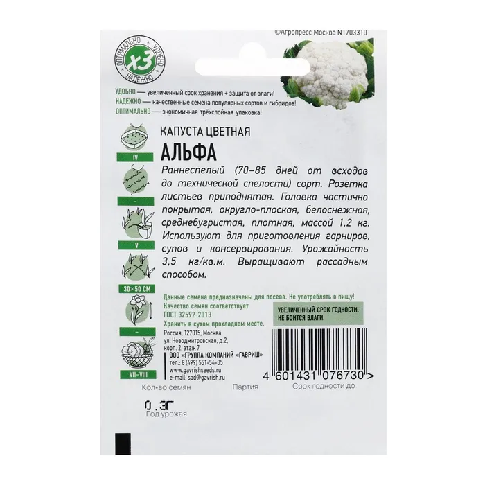 Семена Капуста цветная "Альфа", ц/п, 0,3 г серия ХИТ х3 — Характеристики