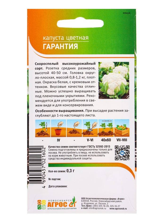Семена Капуста цветная «Гарантия» 0.3 г, «Агросс» — Характеристики