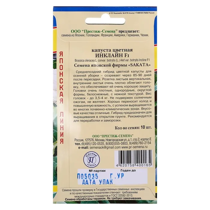 Среднепоздний гибрид цветной капусты для осенней уборки, 80-90 дней после пересадки, посев летом. Головки крупные, плотные, выровненные по размеру, белоснежные, полностью закрыты внутренними листьями, не подвержены солнечным ожогам, не желтеют. Вес головки до 3,5-4 кг. Хорошо переносит болезни, холод и повышенную влажность, выращивается во многих почвенно-климатических зонах. Гибрид предназначен для выращивания в открытом грунте. Для свежего потребления и заморозки.