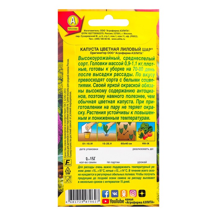 Как сажать. Выращивают рассадным способом в несколько сроков. Рассада готова к посадке через 35–40 дней после всходов. Схема посадки: 35 × 50 см. Цветную капусту необходимо постоянно увлажнять, подкармливать и защищать от болезней и вредителей, почву — рыхлить, окучивать и пропалывать. Головки обязательно притенять. Это растение очень требовательно к питанию и влаге и не переносит кислых почв.