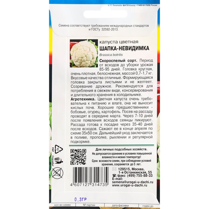 Цветная капуста очень требовательна к питанию и влаге, она не выносит кислых почв. Хорошие предшественники - бобовые, огурец, картофель. Посев на рассаду проводят в середине марта. Через 7-10 дней после появления всходов сеянцы пикируют. Рассада готова к посадке через 35-40 дней после всходов. Сажают ее в конце апреля по схеме 35х50 см. Дальнейший уход заключается в поливе, прополке, рыхлении и регулярной подкормке.