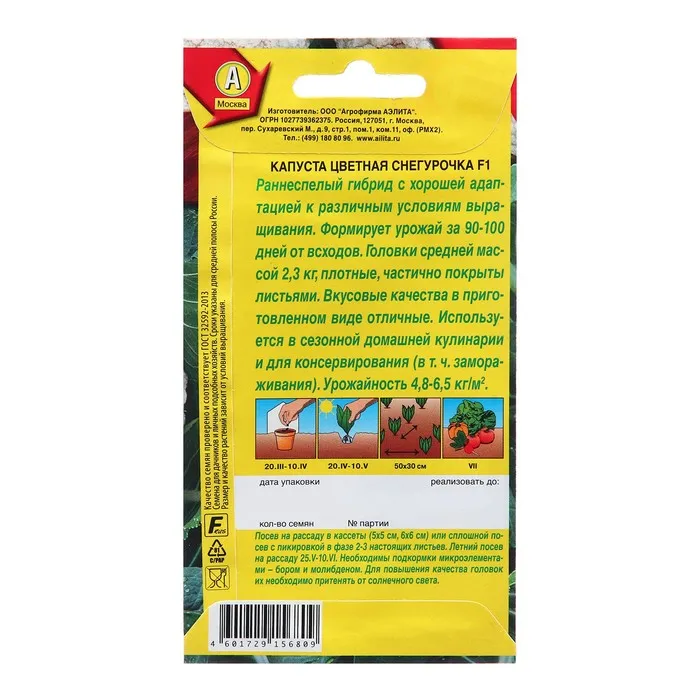 Семена Капуста Снегурочка цветная F1. Новый раннеспелый гибрид. Период от всходов до технической спелости 90-100 дней. Урожайность высокая, 4,8-5,0 кг/м2. Головки округло-плоские, очень крупные, массой 2,2-2,4 кг, плотные. Текстура нежная, хрустящая. Вкусовые качества отличные. Используется для различной домашней кулинарии, консервирования и замораживания. Сорт хорошо хранится в холодильнике после съема и транспортируется. Агротехника. Посев семян на рассаду. Очень важно поддерживать температурный режим: днем 15-18 °С, ночью12-14 °С. Высадка рассады в грунт в возрасте30-35 дней, в фазе 4-5 настоящих листьев. В течение всего сезона нуждается в регулярных обильных поливах. Чтобы получать продукцию до поздней осени, семена на рассаду высевают в несколько сроков с интервалом 15 дней. Растениям необходимы регулярные прополки, рыхления и подкормки.