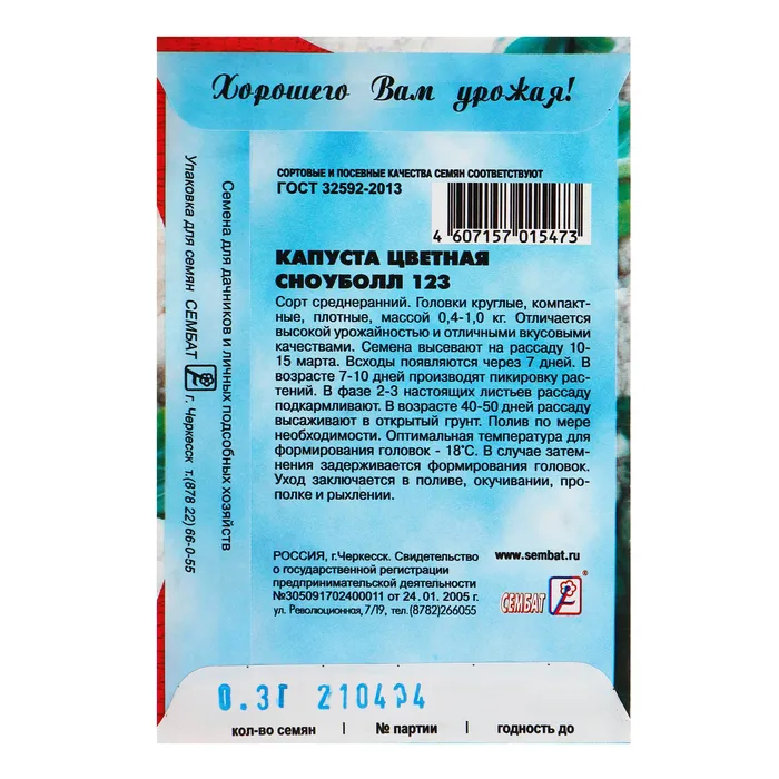 На рассаду высаживают в марте-апреле. Глубина заделки семян 5мм. При t 18-20°С всходы появятся через 4-7 дней, после появления всходов t понижают до 12°С. Еще через неделю дневную t устанавливают на уровне 17°С. Через 8-10 дней от всходов сеянцы пикируют в стаканчики, заглубляя их до семядольных листьев. В период выращивания необходимо проводить подкормки минеральными удобрениями, полив, проветривание, следить за тем, чтобы рассада не вытягивалась. Первую подкормку проводят через 8-10 дней после пикировки, растворяя на 10л воды 10г мочевины, 20г суперфосфата, 10г калийных удобрений. Вторую подкормку проводят через 1-2 недели после первой, увеличив дозировку в 1,5 раза. За неделю до высадки рассады в открытый грунт её начинают закаливать. Высадка рассады на постоянное место производится через 40-50 дней от всходов. При высадке рассаду заглубляют до первых настоящих листочков. Размещают ее после огурцов, бобовых, корнеплодов (кроме крестоцветных), картофеля и зеленных культур, на заранее подготовленный и удобренный органическими и минеральными удобрениями с осени или весной участок. Плотность посадки - 3-4 раст/м². Можно сеять сразу в открытый грунт в конце мая - начале апреля, накрывая посевы укрывным материалом. Уход -регулярный полив (каждые 3-4 дня, а в жаркий период и чаще) и 3 подкормки минеральными или органическими удобрениями в период до образования кочана. 3-ю подкормку полным минеральным удобрением проводят в начале образования головок. В период завязывания головок поливы лучше производить дождеванием, увлажняя воздух. После полива проводят неглубокое рыхление. Через 2 недели от высадки - окучивание. Головки цветной капусты притеняют от солнца, надламывая лист. При уборке головку срезают с 4-6 прилегающими к ней листьями, верхние концы которых обрезают вровень с головкой. Цветную капусту при оптимальной температуре 0-20С хранят 2-3 месяца. Для хранения выбирают здоровые, не поврежденные головки, листья оставляют. Затем кочанчики упаковывают в пищевую пленку и убирают на хранение.