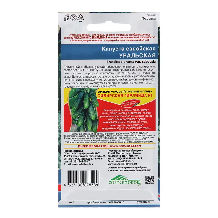 Семена Капуста савойская Уральская. Популярный, стабильно урожайный, позднеспелый сорт. Лист крупный, светло-зелёный, сильнопузырчатый, гофрированный. Кочаны округлые, плотные, на разрезе желтоватые, массой до 2,5 кг, отличного вкуса. Ценность сорта: высокая урожайность, устойчивость к растрескиванию, непродолжительное хранение, устойчивость к бактериозам и фузариозному увяданию. Рекомендуется для приготовления витаминных салатов, щей, голубцов, начинки для пирогов.