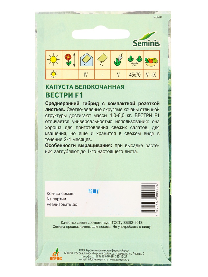 Семена Капуста «Вестри», F1, 15 шт., «Агросс» — Характеристики