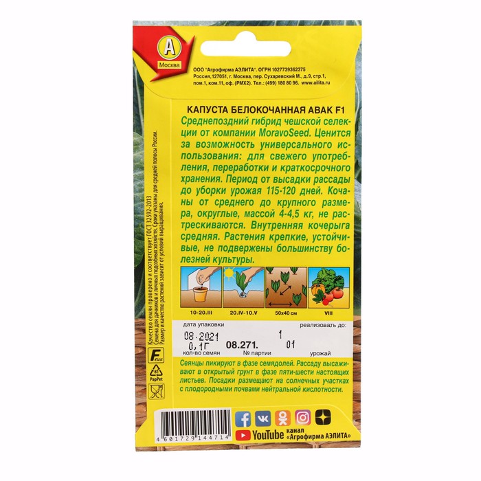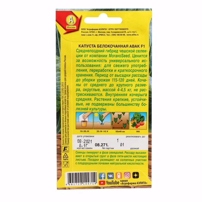 Семена Капусты белокочанной "Авак", F1, ц/п, 0,1 г — Характеристики