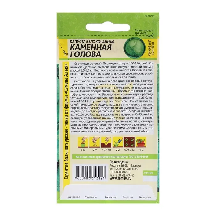 Сорт позднеспелый. Период вегетации 140-150 дней. Кочаны стандартные, выравненные, округло-плоской формы, массой 3,5-5,0 кг. Плотность кочана высокая. Вкусовые качества отличные. Ценность сорта: высокая урожайность, устойчивость к болезням, отличное зимнее хранение.