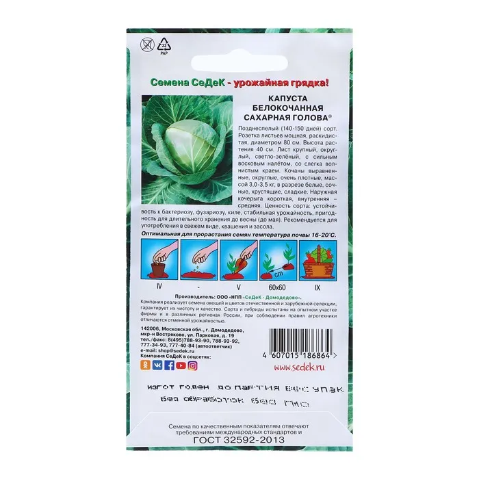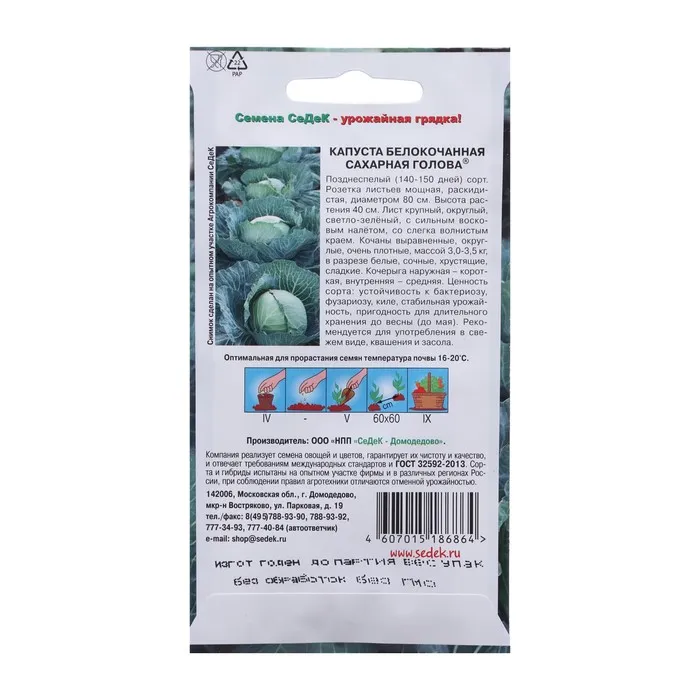 Позднеспелый (140-150 дней) сорт. Розетка листьев мощная, раскидистая, диаметром 80 см. Высота растения 40 см. Лист крупный, округлый, светло-зелёный, с сильным восковым налётом, со слегка волнистым краем. Кочаны выравненные, округлые, очень плотные, массой 3,0-3,5 кг, в разрезе белые, сочные, хрустящие, сладкие. Кочерыга наружная – короткая, внутренняя – средняя. Ценность сорта: устойчивость к бактериозу, фузариозу, киле, стабильная урожайность, пригодность для длительного хранения до весны (до мая). Рекомендуется для употребления в свежем виде, квашения и засола.