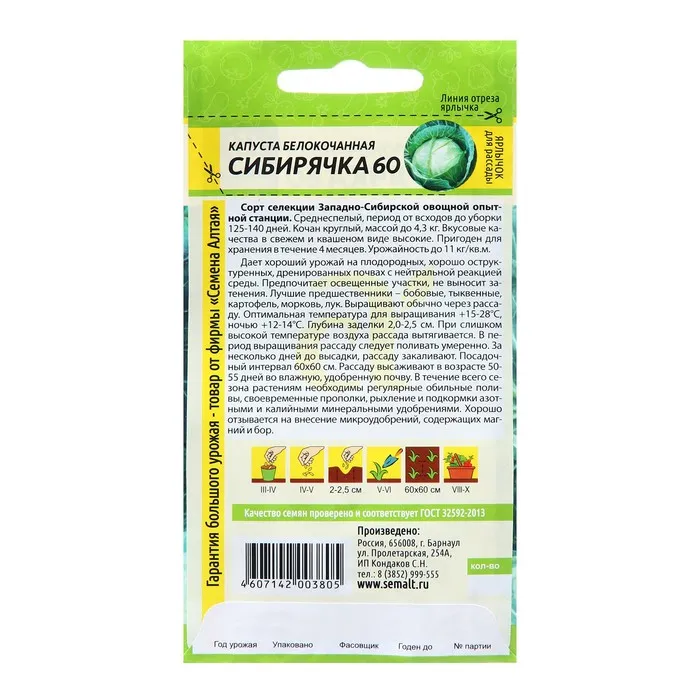 Сорт селекции Западно-Сибирской овощной опытной станции. Среднеспелый, период от всходов до уборки 125-140 дней. Кочан круглый, массой до 4,3 кг. Вкусовые качества в свежем и квашенном виде высокие. Пригоден для хранения в течении 4 месяцев. Урожайность до 11 кг/м. Дает хороший урожай на плодородных, легкосуглинистых и сугли-нистых почвах. На кислых почвах растет плохо. При недостатке света образуются мелкие листья и рыхлые кочаны. Лучшие предшественники — бобовые, тыквенные, паслёновые растения (перец, томат, картофель), лук.